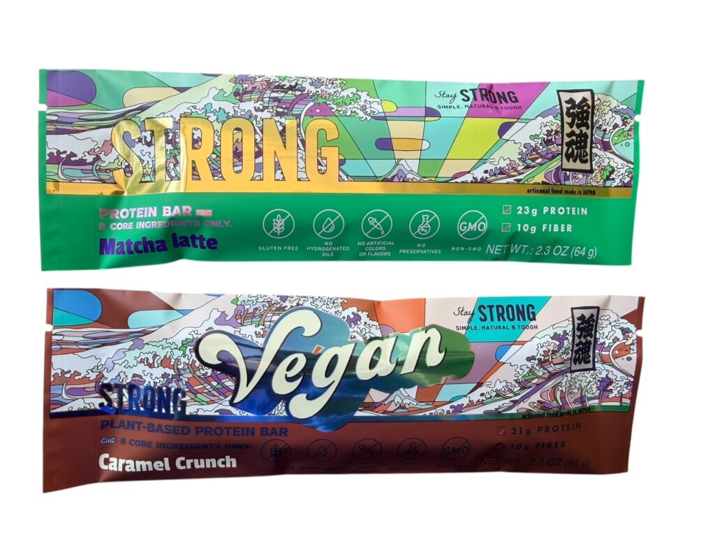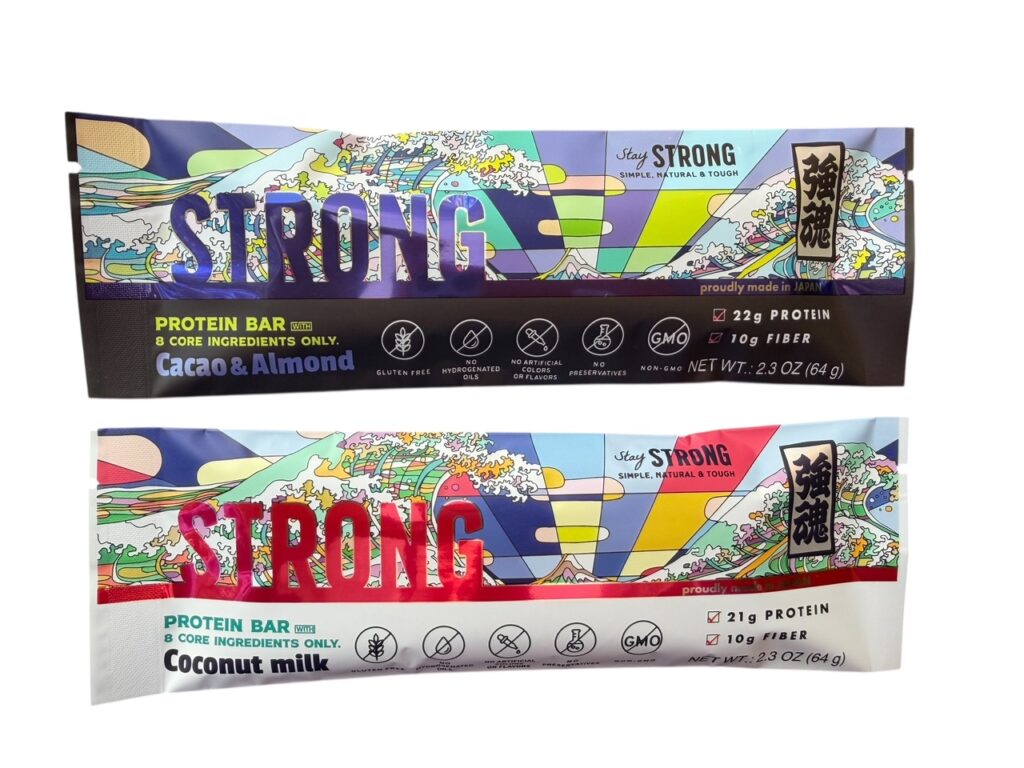 発売するストロングバーは4種類※2(カカオ&アーモンド、ココナッツミルク、マッチャラテ、ヴィーガン キャラメルクランチ)。パッケージは輸出専用の新デザインを採用し、日本品質を想起してもらえるよう、湘南の海と富士山をモチーフにしています。