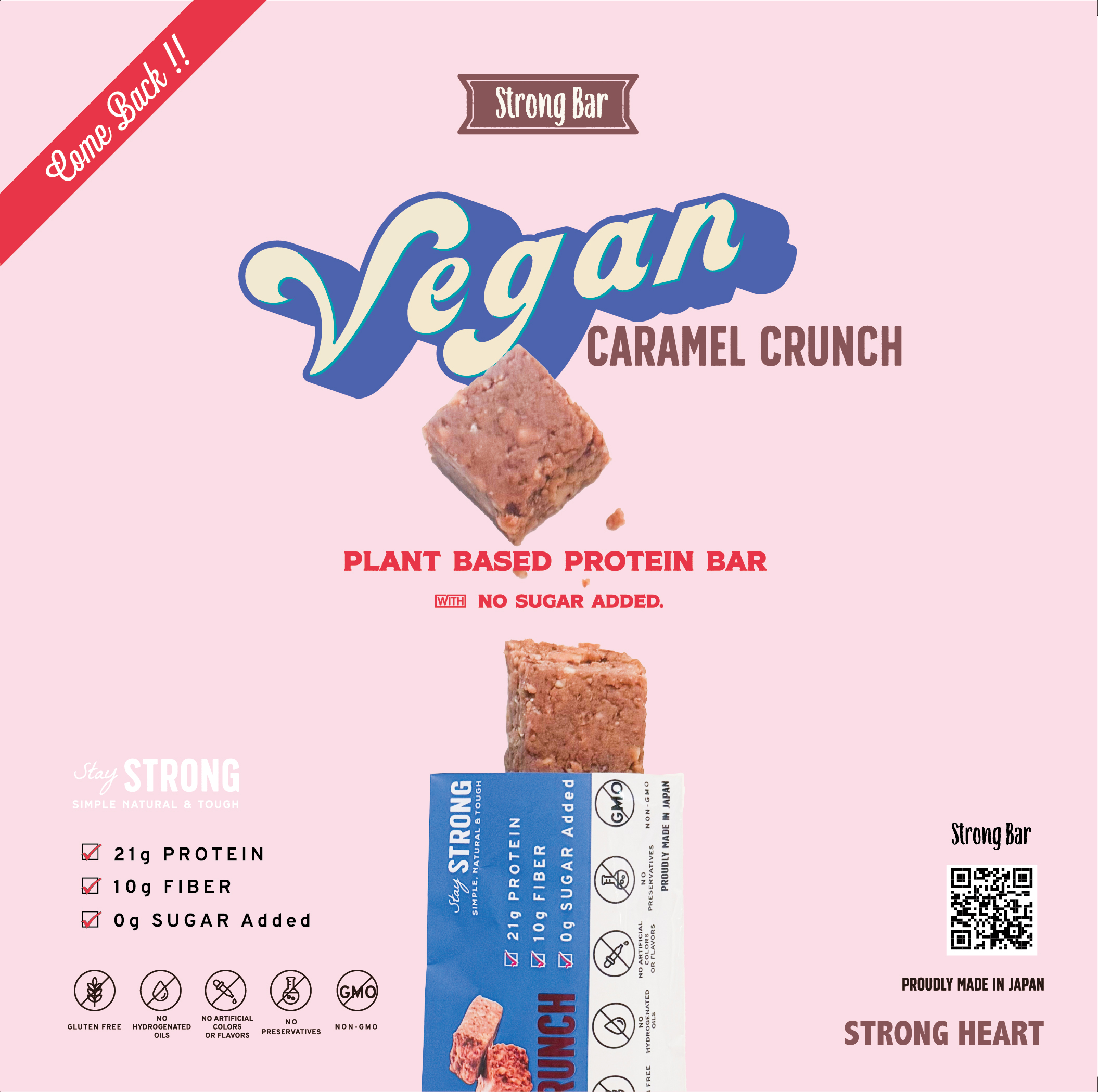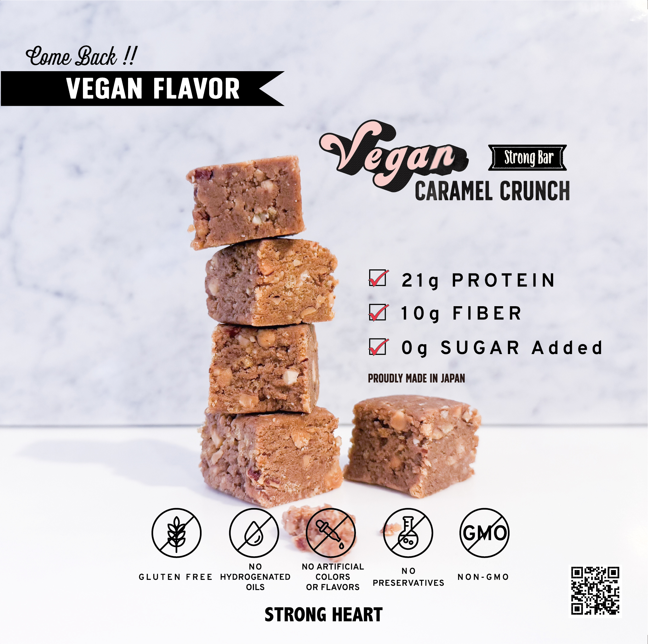 株式会社ストロングハート(本社:東京都港区、代表取締役:鈴木一也)は、えんどう豆由来の植物性プロテインを使用した「STRONGBAR VEGAN CARAMEL CRUNCH(以下、ストロングバーヴィーガン)」をリニューアルし、2025年6月20日より当社「STRONGHEART SHOP」*1にて販売を開始しました。